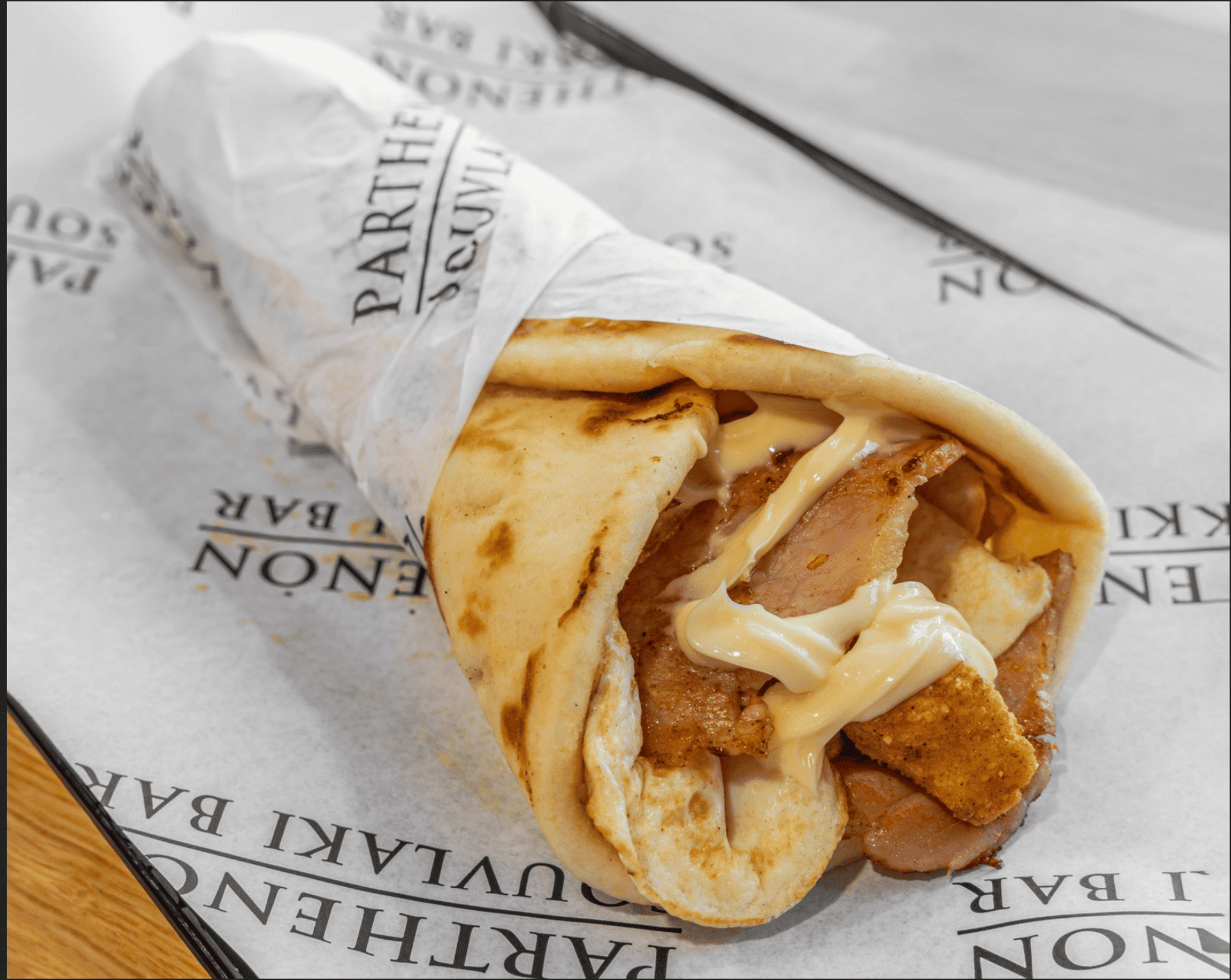 Gluten free. Free range 2 eggs, bacon and halloumi fries wrapped up in warm small pita bread with home made mayo.