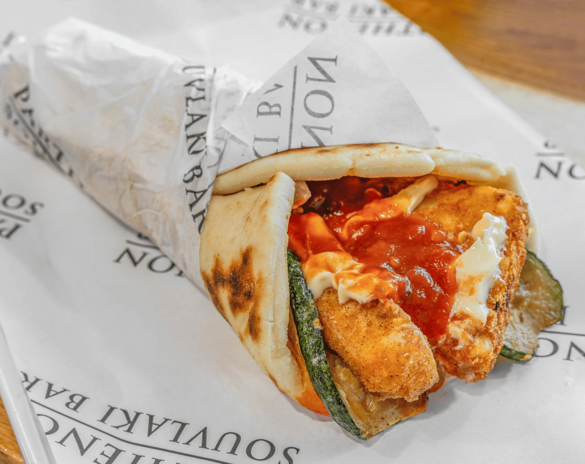 Vegetarian. Hash brown, grilled red peppers, tomatoes, lettuce and halloumi fries rolled up in warm small pita bread with chunky salsa and home made mayo.